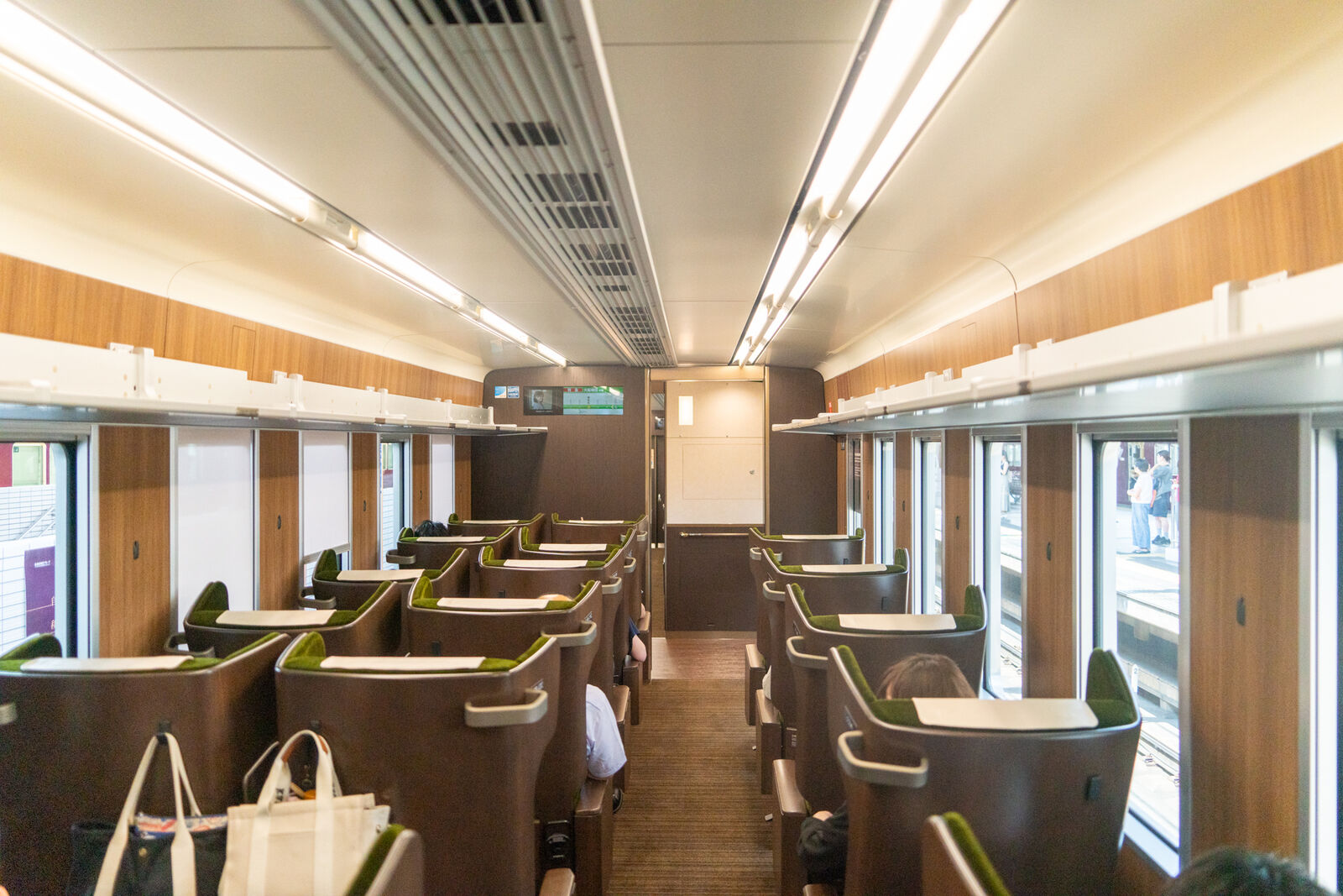 車内。座席が上からみたらU字になっているのがわかりますでしょうか。これがなかなかパーソナルスペース的にありがたい感じでした。